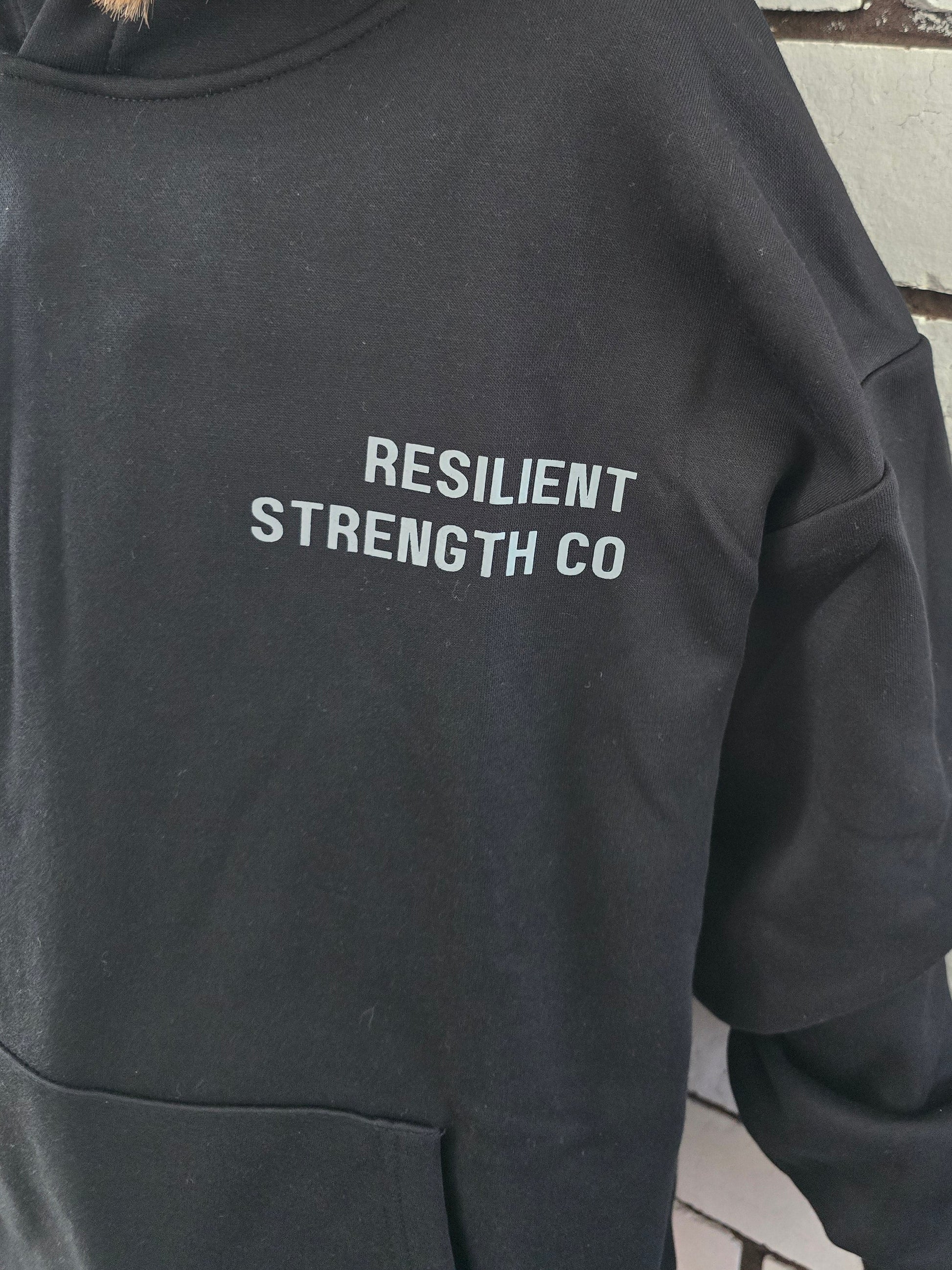 •This black Resilient Strength Co Hoodie is a true to size Oversized fit and features our signature bold back print: